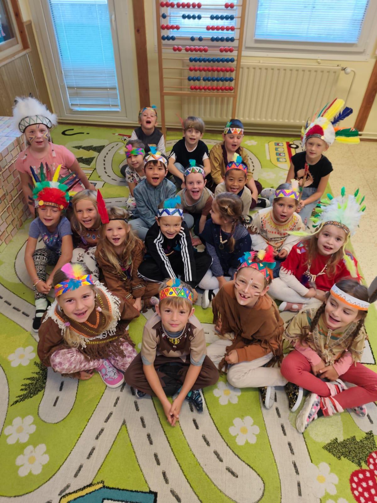 Děti z prvních tříd se už od začátku školního roku zvládly naučit spoustu nových věcí. Učily se písmenko I. Pracovaly ve dvojicích a vyzkoušely si i týmovou práci v „kmenech“. Vymýšlely slova začínající na nové písmenko, přiřazovaly slova k obrázku. Naučily se říkanku a písničku o indiánech, vymýšlely si indiánská jména. V matematice řešily obrázkové sudoku, počítaly indiánské předměty a porovnávaly jejich počty, luštily rébusy. Při výtvarné výchově si děti společně vyrobily totem a při pracovních činnostech čelenku a náhrdelník. V tělocviku se všem podařilo překonat indiánskou stezku plnou různých překážek. Venku je pak čekalo indiánské putování, kde si žáčci vyzkoušeli svoje pozorovací schopnosti. Za všechny splněné úkoly sbírali indiáni peříčka na své čelenky a za podařené týmové úkoly získali pro svůj kmen obrázky s indiánskou tematikou. Vyvrcholením indiánského učení bylo setkání všech prvňáčků a společný zpěv i tanec za zvuků bubnu.