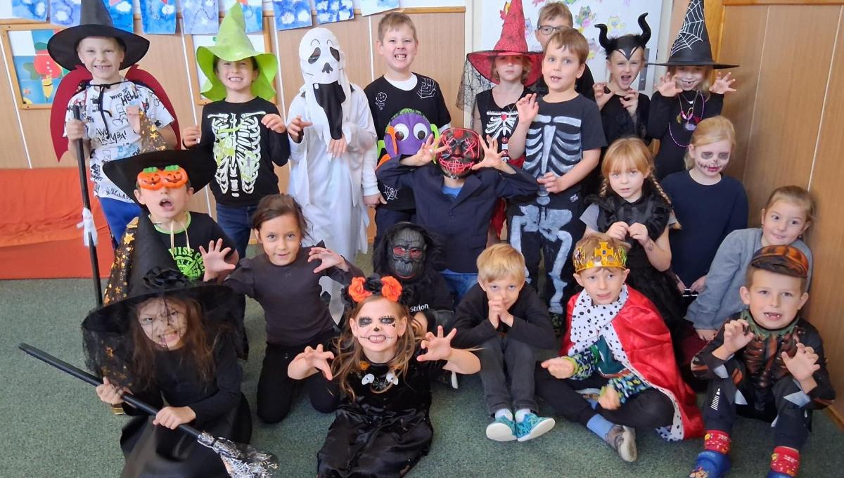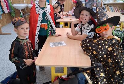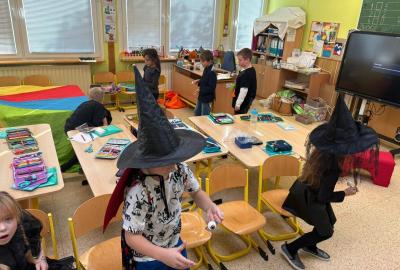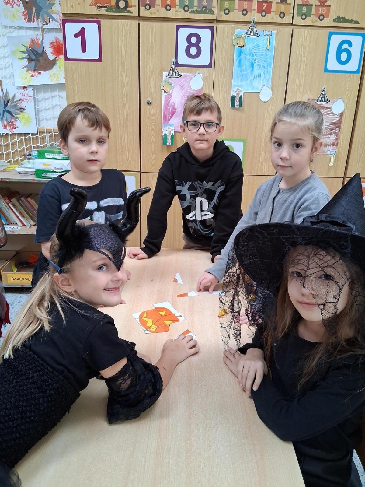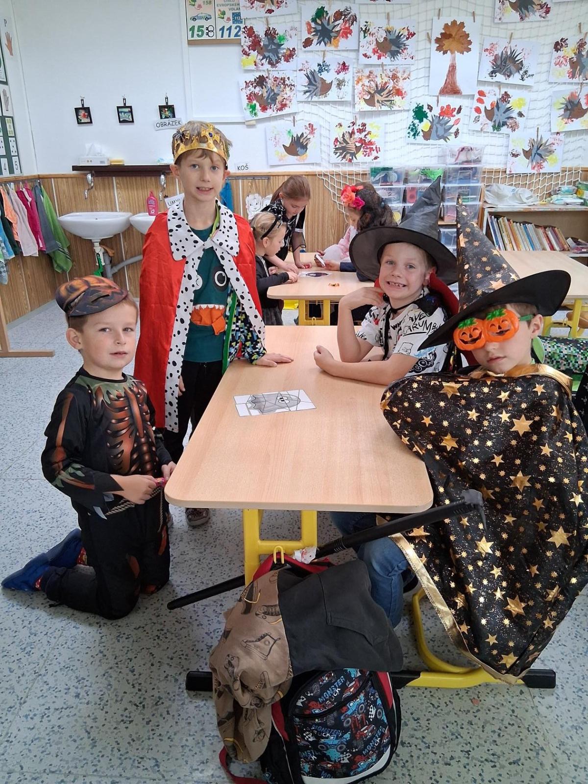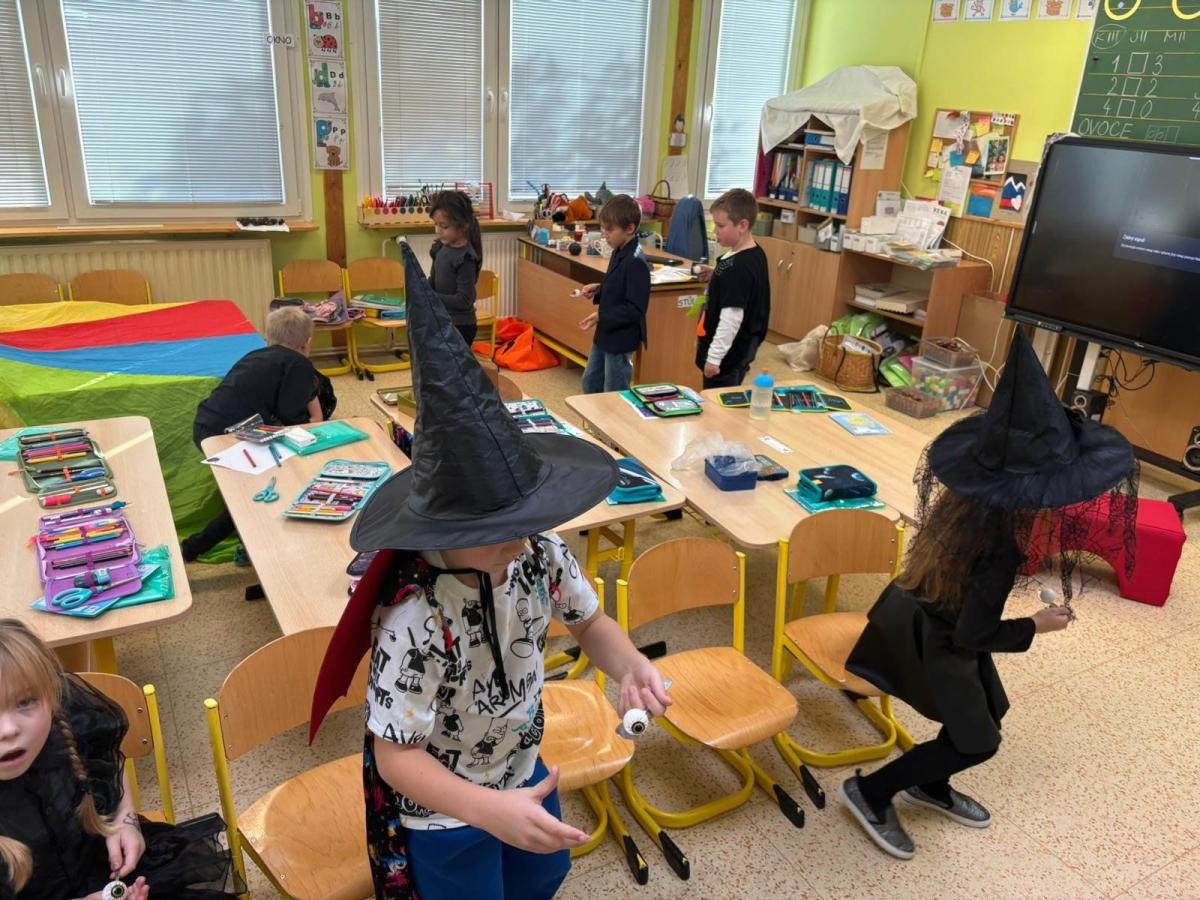 Už od rána se to u nás hemžilo čarodějnicemi, čaroději, strašidly, kostlivci a duchy. Všichni plnili různé úkoly v pracovním listu, vyráběli strašidelné prstové loutky a díky jedné mamince si vybarvili i sádrové odlitky s halloweenskou tematikou. Došlo na promenádu všech tříd v maskách i na společný tanec. Pak se děti ve skupinkách vypravily plnit postupně různé úkoly do všech tříd v pavilonku. Čekalo je překonávání pavučinové dráhy, přenášení „oka“ na lžíci určenou trasou i týmové skládání strašidelných obrázků. A kdo se nebál, mohl rukou zkoumat roztodivné předměty schované v krabici. Za to si mohl vzít želé pavouka od šklebící se čarodějnice. Užili jsme si hlavně spoustu legrace a to je dobře, protože smích je vždycky potřeba.