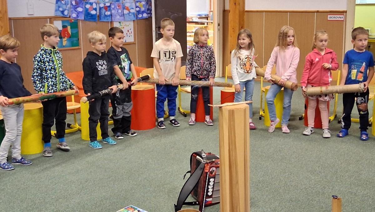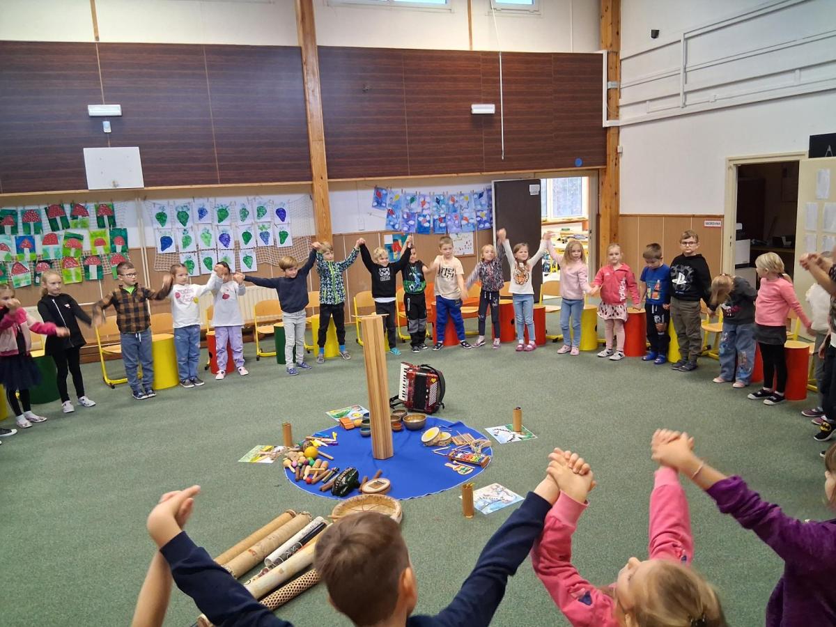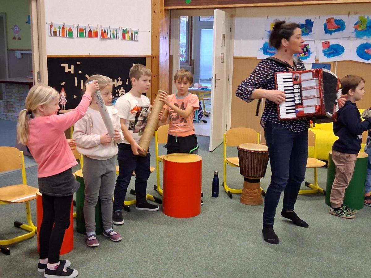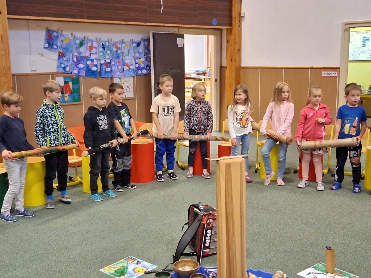 Trénovali jsme společné hraní se zpěvem jednoduchých písniček, které se vztahovaly k jednotlivým ročním obdobím. Doprovázeli jsme bubnováním paní lektorku, která hrála na akordeon. Viděli jsme netradiční (indické a tibetské) hudební nástroje, na které jsme si také mohli zahrát. Byl to pro nás zážitek a zároveň jsme při bubnování skvěle uvolnili přebytečnou energii.