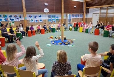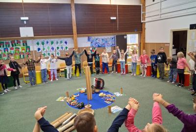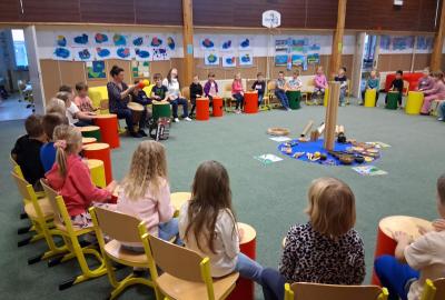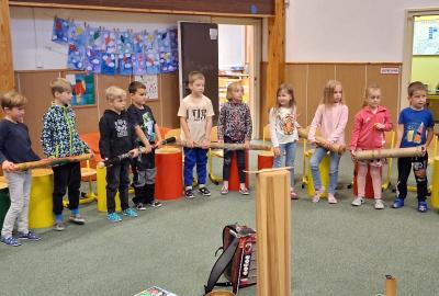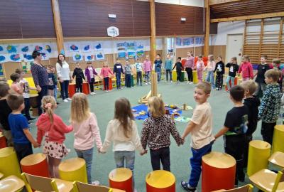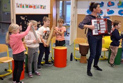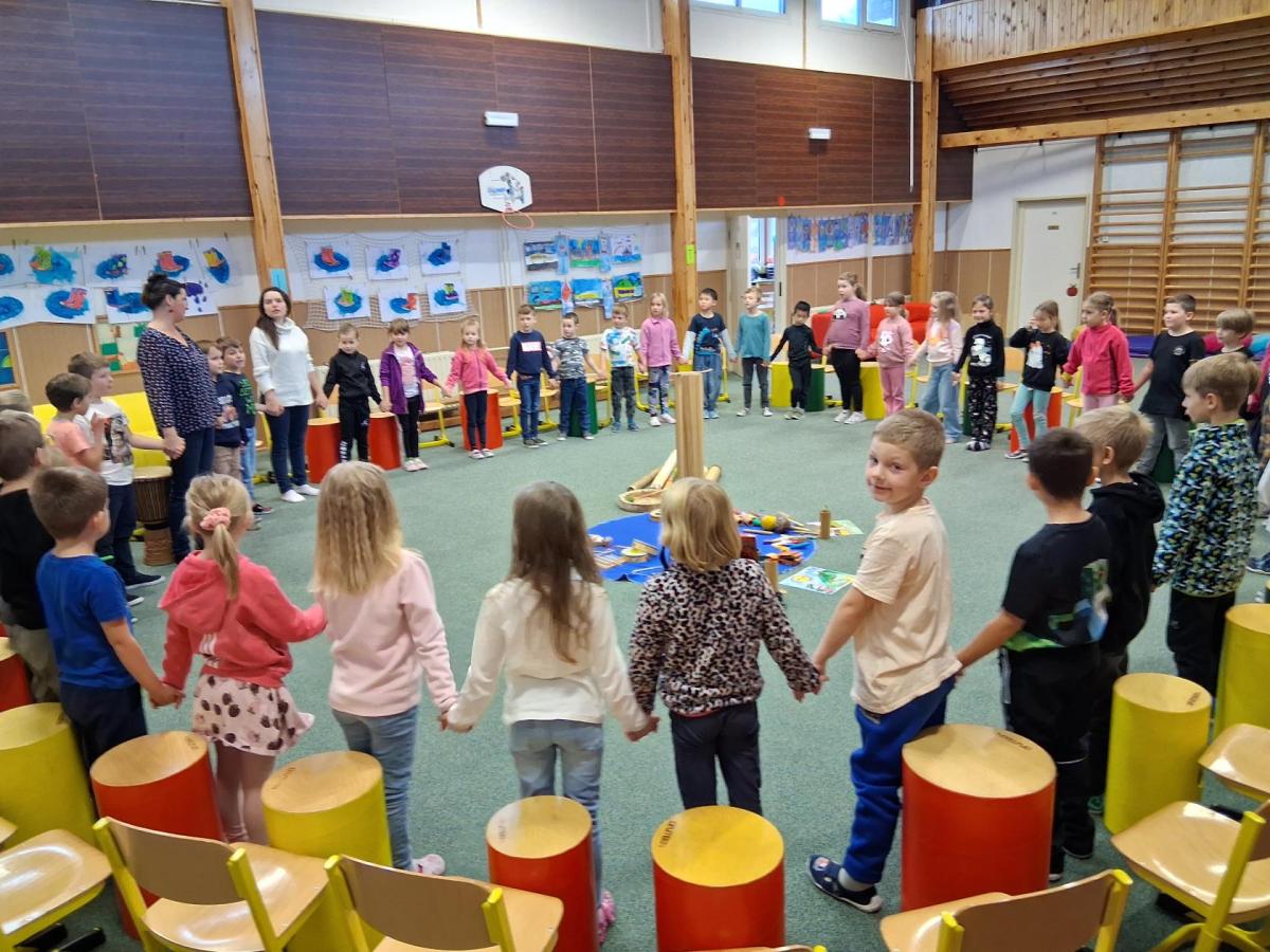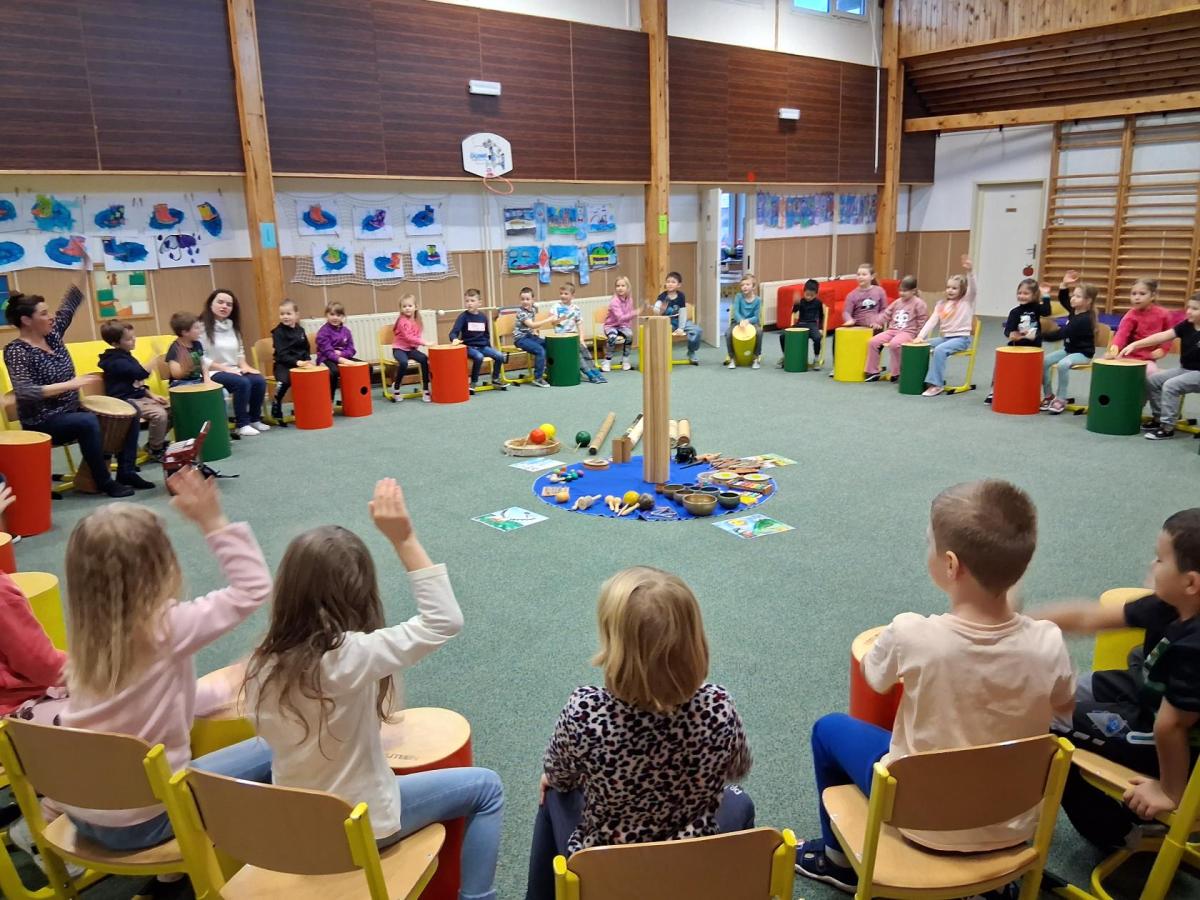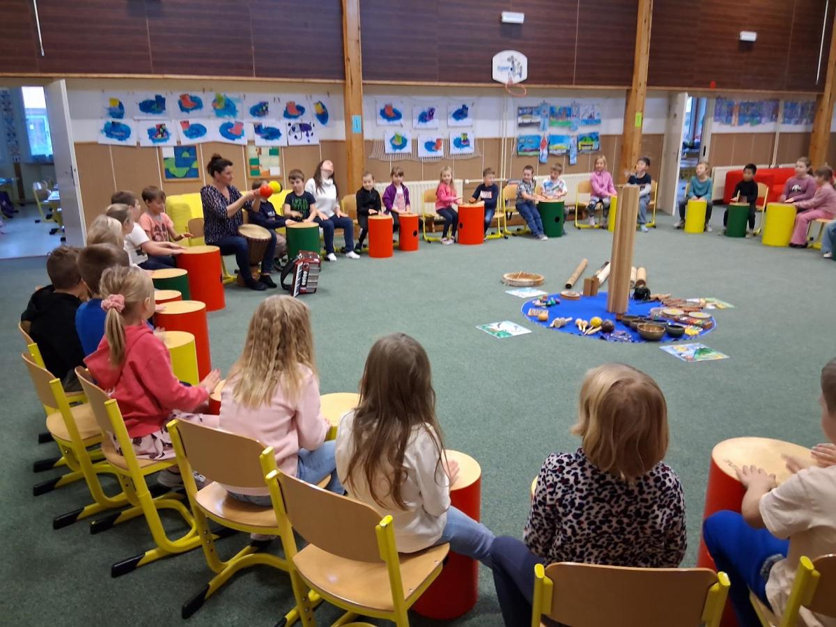 Trénovali jsme společné hraní se zpěvem jednoduchých písniček, které se vztahovaly k jednotlivým ročním obdobím. Doprovázeli jsme bubnováním paní lektorku, která hrála na akordeon. Viděli jsme netradiční (indické a tibetské) hudební nástroje, na které jsme si také mohli zahrát. Byl to pro nás zážitek a zároveň jsme při bubnování skvěle uvolnili přebytečnou energii.