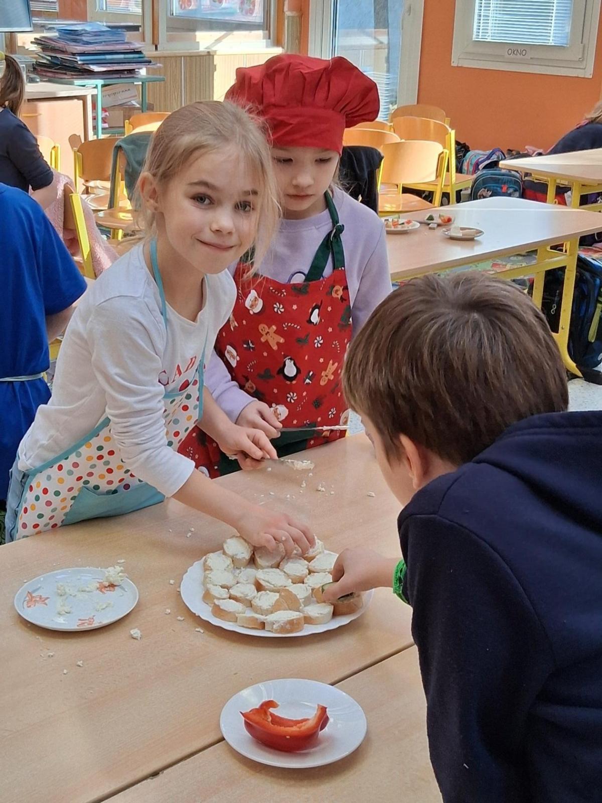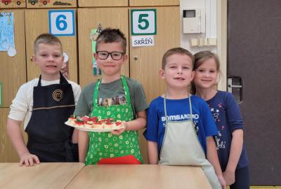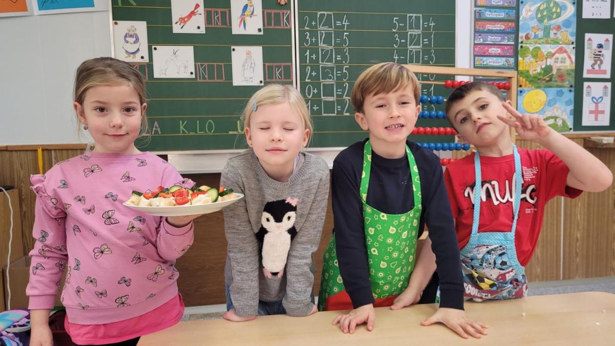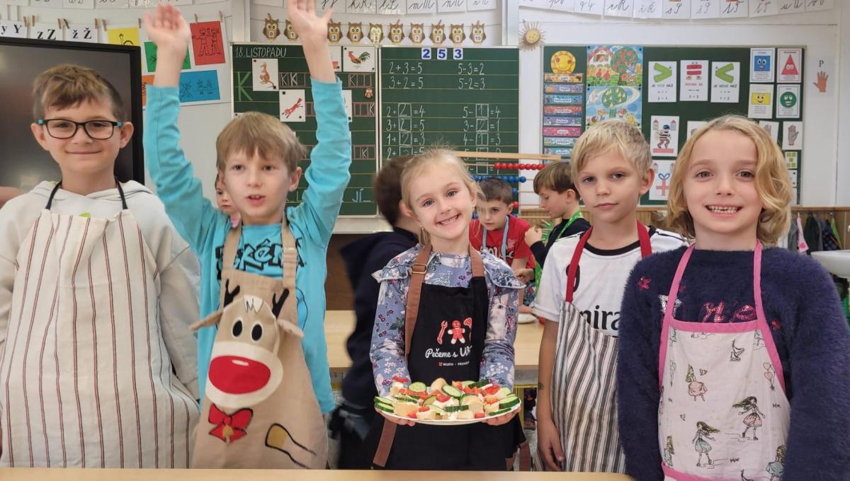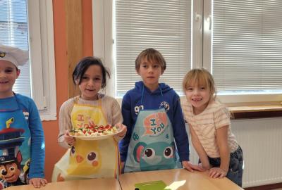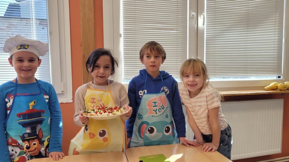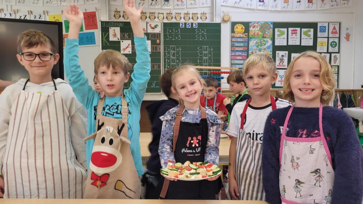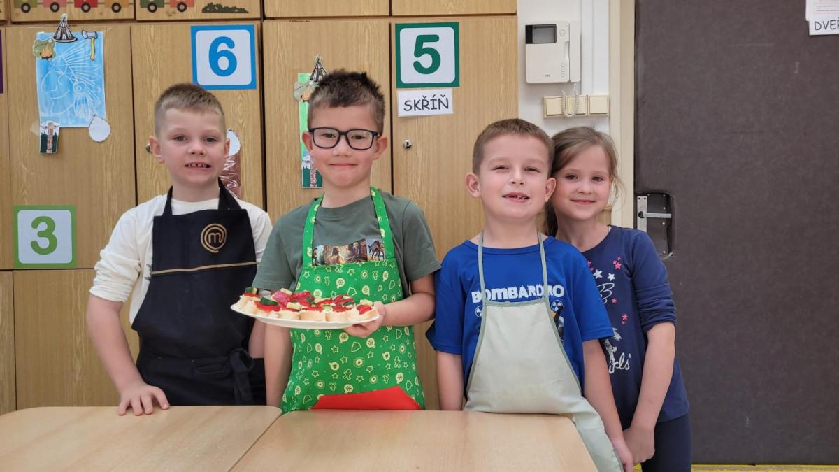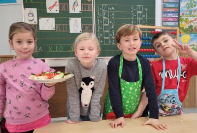 Umíme už spoustu písmenek. K procvičování velkého tiskacího K nám paní učitelka připravila projektovou výuku. Nejprve jsme si poslechli příběh o kuchaři Kamilovi, kterého zlý čaroděj zbavil umění vařit. Dozvěděli jsme se, že zachránit ho můžeme my, pokud splníme několik různých úkolů. To byla výzva a tak jsme se hned pustili do práce. Někdy sami, ale většinou v menších skupinách, jsme běhali, hledali a zapisovali slova s písmenem K, skládali věty ze slov a přiřazovali je k obrázku. Počítali jsme příklady, luštili tajenku, třídili ovoce a zeleninu atd. Posledním úkolem bylo připravit zdravou svačinku. Pro někoho běžná činnost, pro někoho první zkušenost s přípravou pokrmu. I tento úkol jsme ale společně zvládli, prstíčky po krájení zůstaly bez újmy a my měli velkou radost z povedených jednohubek, ze kterých brzy nezbyl ani drobeček. Nakonec jsme zjistili, že záchrana kuchaře Kamila se nám podařila, protože nám za odměnu připravil banánové muffiny, které nám moc chutnaly. Nakonec jsme se naučili písničku Muzikantská rodina, kterou jsme doprovodili mimo jiné hrou na vařečky nebo skleničky. Byl to prima den.