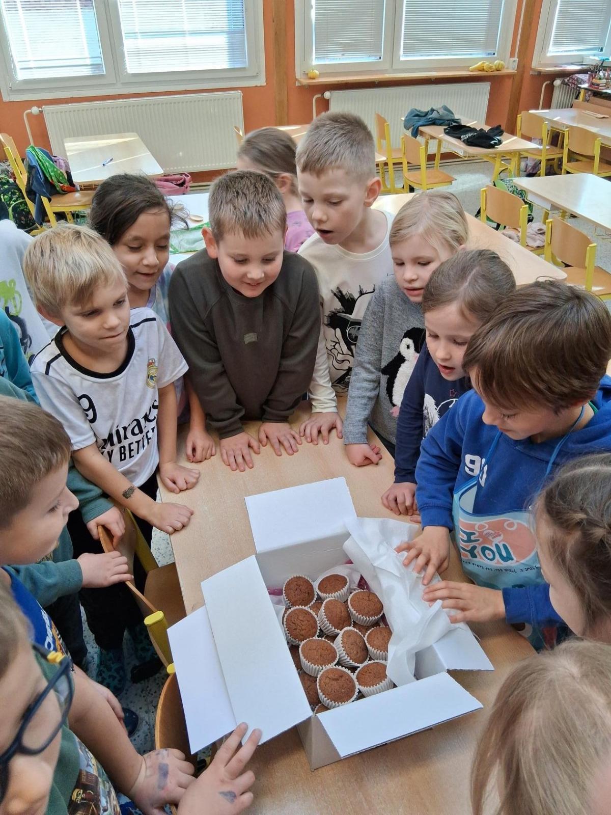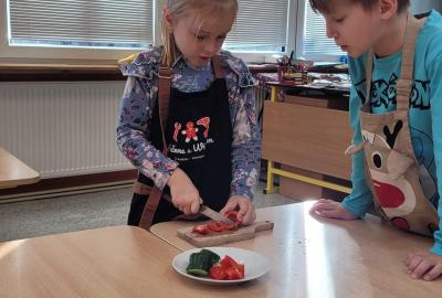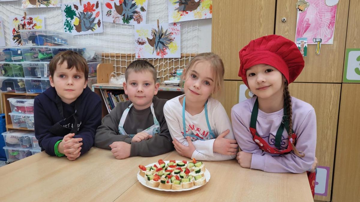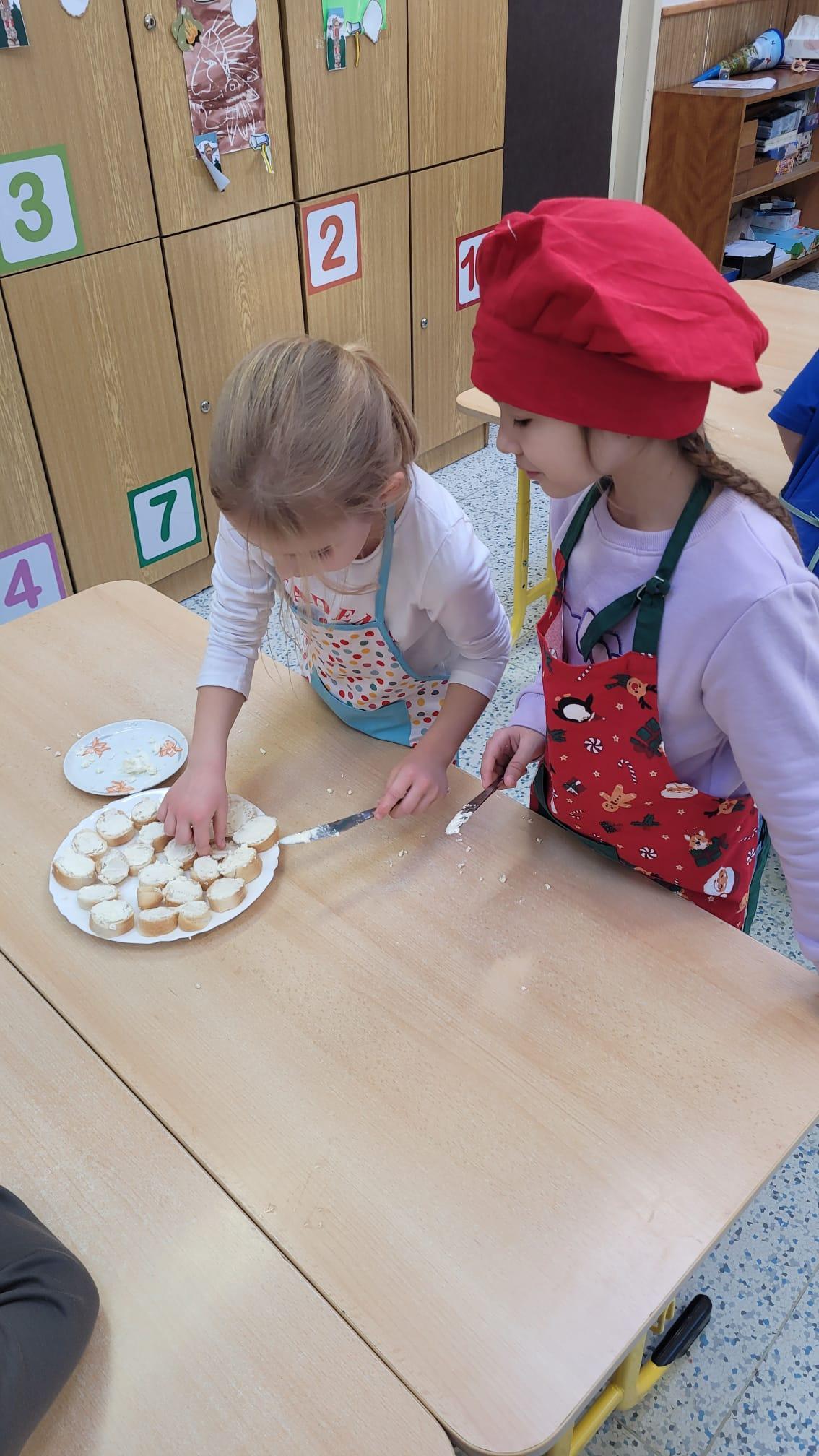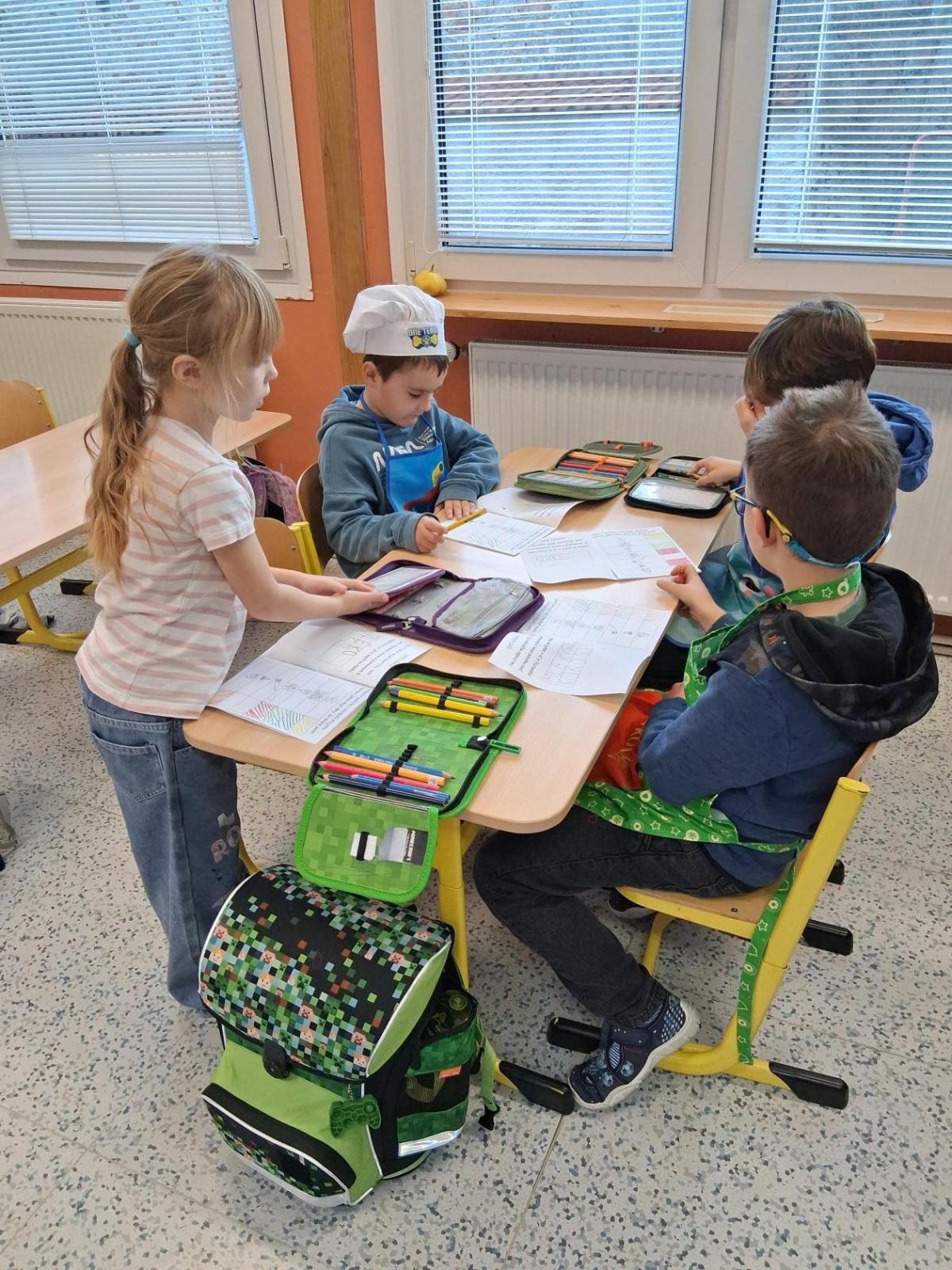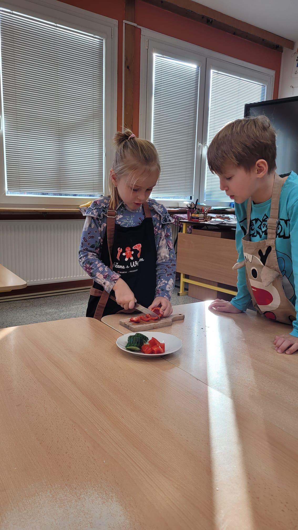 Umíme už spoustu písmenek. K procvičování velkého tiskacího K nám paní učitelka připravila projektovou výuku. Nejprve jsme si poslechli příběh o kuchaři Kamilovi, kterého zlý čaroděj zbavil umění vařit. Dozvěděli jsme se, že zachránit ho můžeme my, pokud splníme několik různých úkolů. To byla výzva a tak jsme se hned pustili do práce. Někdy sami, ale většinou v menších skupinách, jsme běhali, hledali a zapisovali slova s písmenem K, skládali věty ze slov a přiřazovali je k obrázku. Počítali jsme příklady, luštili tajenku, třídili ovoce a zeleninu atd. Posledním úkolem bylo připravit zdravou svačinku. Pro někoho běžná činnost, pro někoho první zkušenost s přípravou pokrmu. I tento úkol jsme ale společně zvládli, prstíčky po krájení zůstaly bez újmy a my měli velkou radost z povedených jednohubek, ze kterých brzy nezbyl ani drobeček. Nakonec jsme zjistili, že záchrana kuchaře Kamila se nám podařila, protože nám za odměnu připravil banánové muffiny, které nám moc chutnaly. Nakonec jsme se naučili písničku Muzikantská rodina, kterou jsme doprovodili mimo jiné hrou na vařečky nebo skleničky. Byl to prima den.