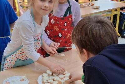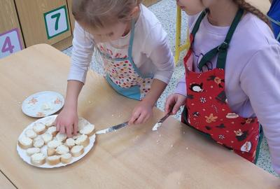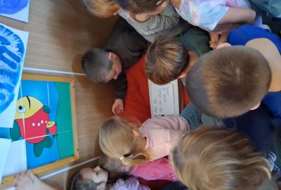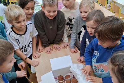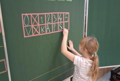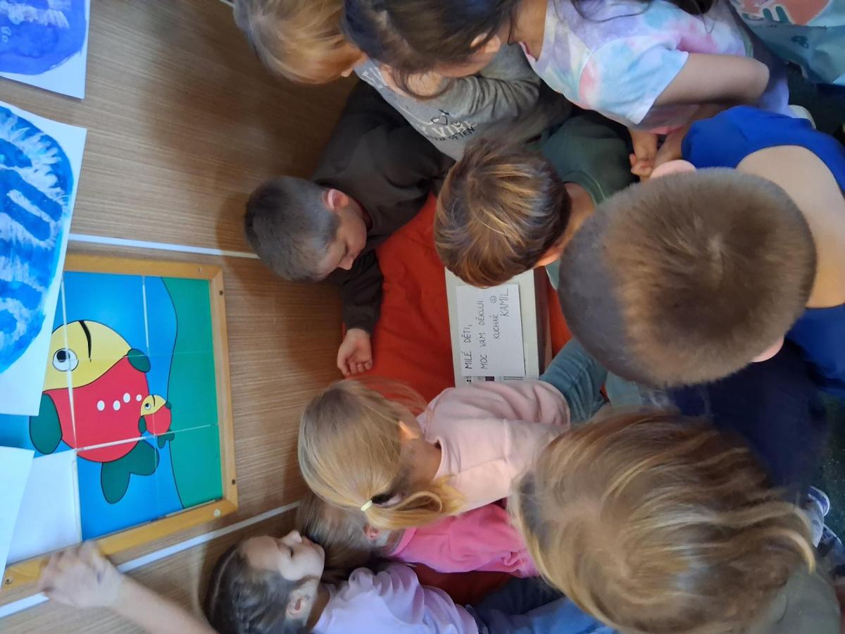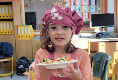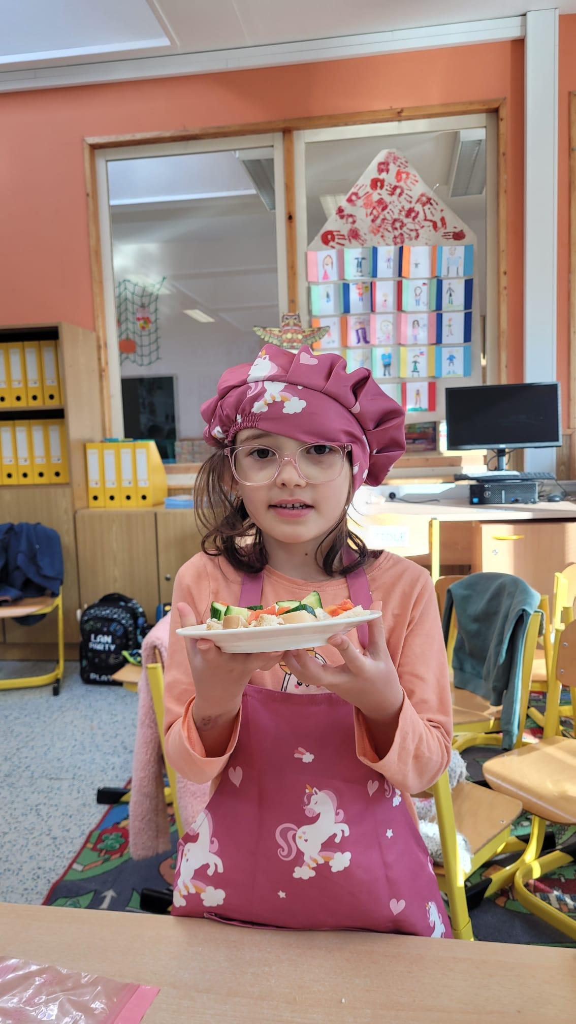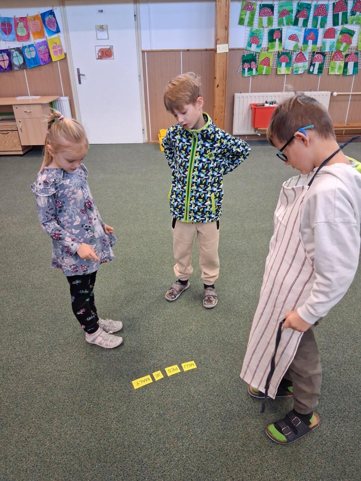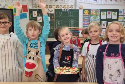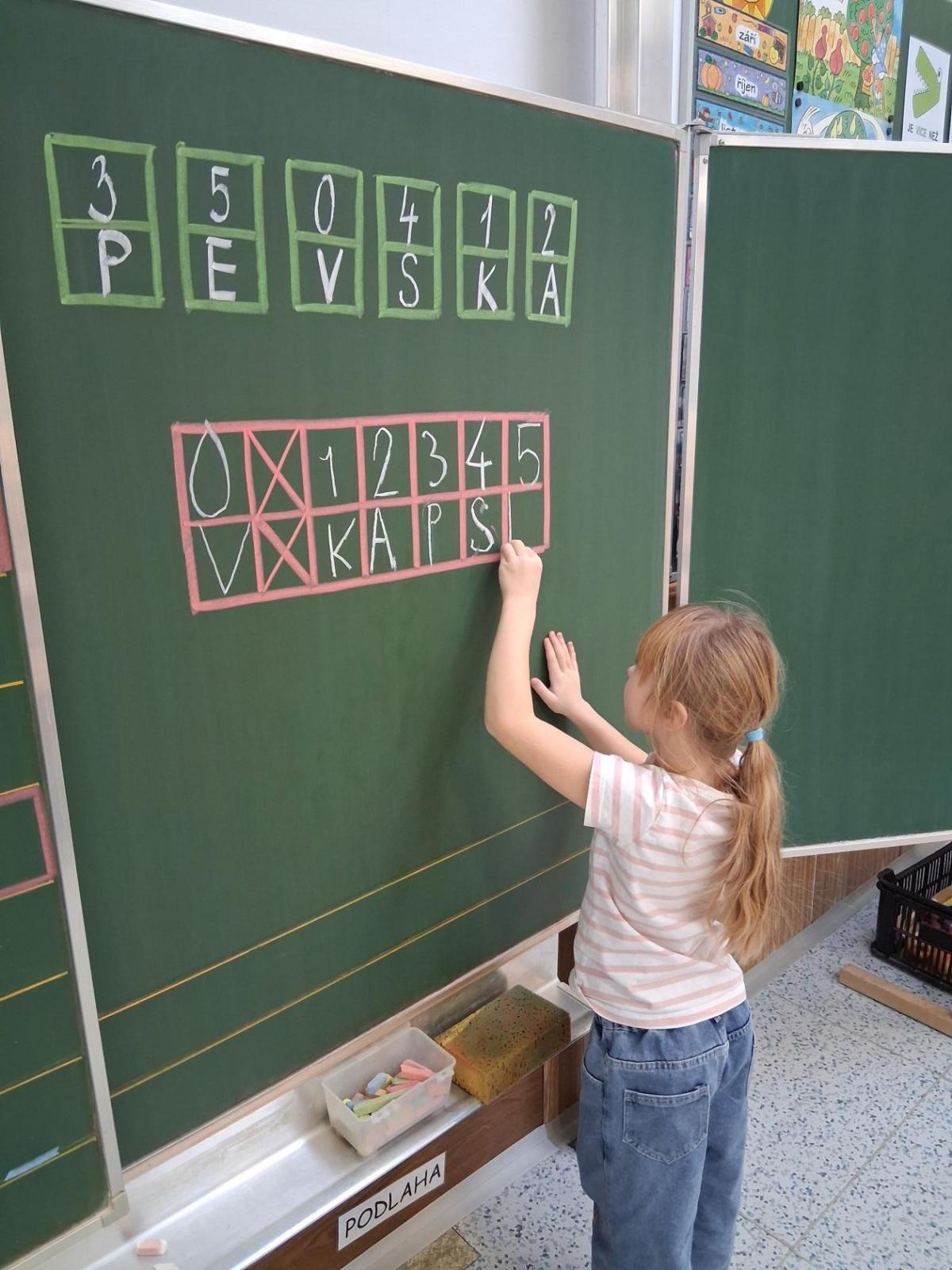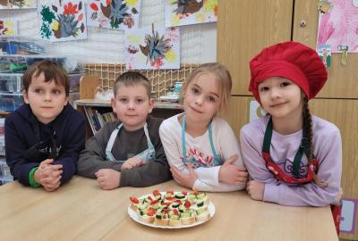 Umíme už spoustu písmenek. K procvičování velkého tiskacího K nám paní učitelka připravila projektovou výuku. Nejprve jsme si poslechli příběh o kuchaři Kamilovi, kterého zlý čaroděj zbavil umění vařit. Dozvěděli jsme se, že zachránit ho můžeme my, pokud splníme několik různých úkolů. To byla výzva a tak jsme se hned pustili do práce. Někdy sami, ale většinou v menších skupinách, jsme běhali, hledali a zapisovali slova s písmenem K, skládali věty ze slov a přiřazovali je k obrázku. Počítali jsme příklady, luštili tajenku, třídili ovoce a zeleninu atd. Posledním úkolem bylo připravit zdravou svačinku. Pro někoho běžná činnost, pro někoho první zkušenost s přípravou pokrmu. I tento úkol jsme ale společně zvládli, prstíčky po krájení zůstaly bez újmy a my měli velkou radost z povedených jednohubek, ze kterých brzy nezbyl ani drobeček. Nakonec jsme zjistili, že záchrana kuchaře Kamila se nám podařila, protože nám za odměnu připravil banánové muffiny, které nám moc chutnaly. Nakonec jsme se naučili písničku Muzikantská rodina, kterou jsme doprovodili mimo jiné hrou na vařečky nebo skleničky. Byl to prima den.