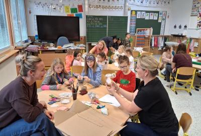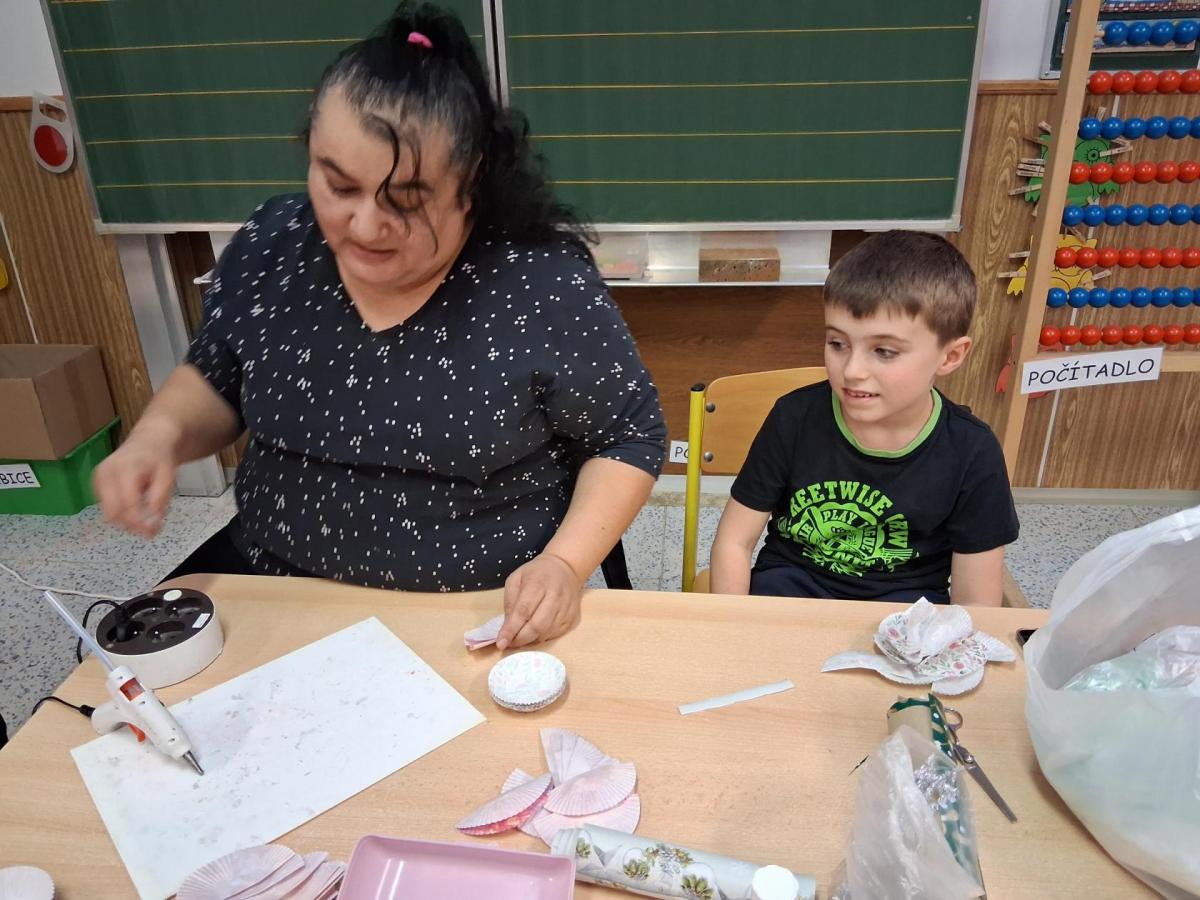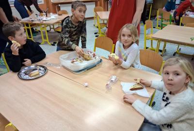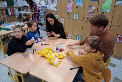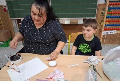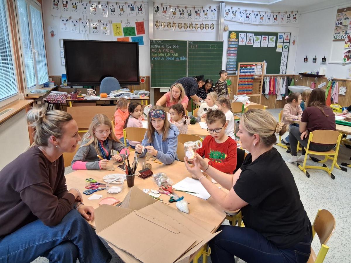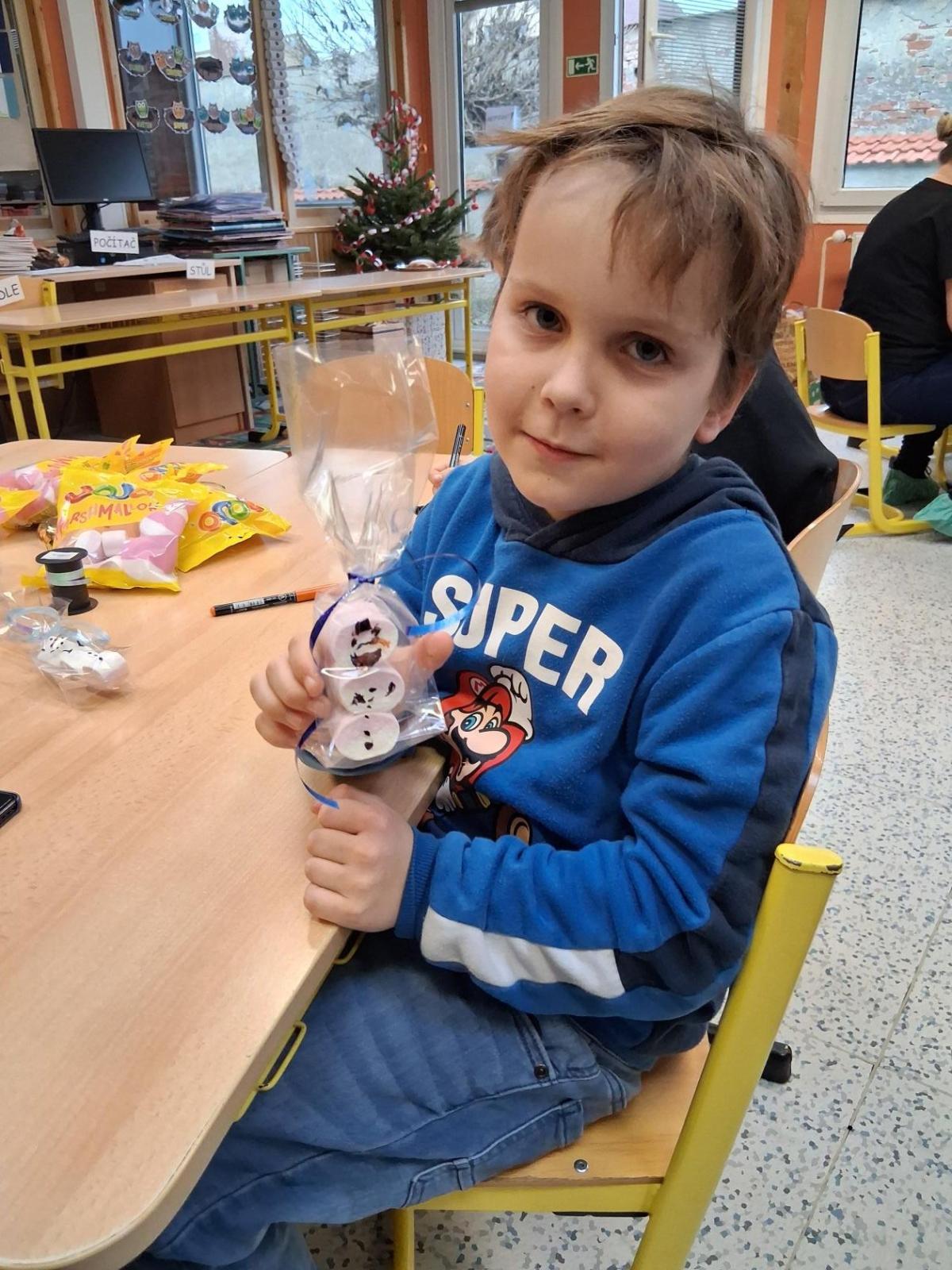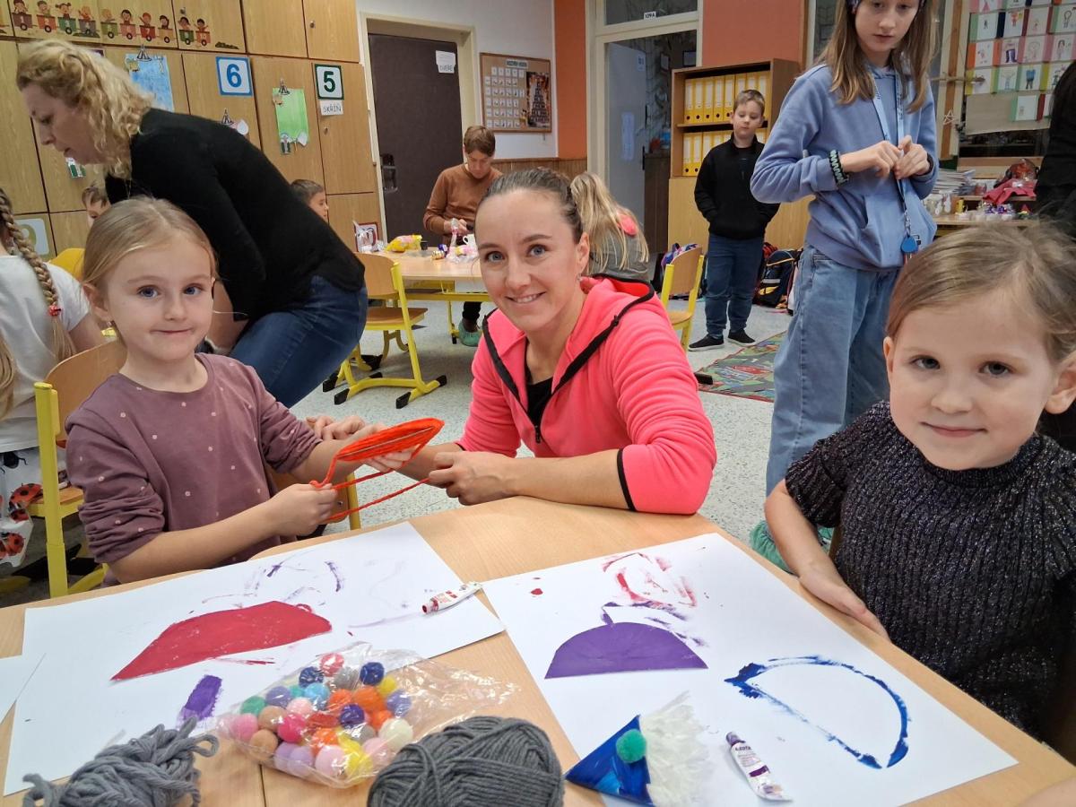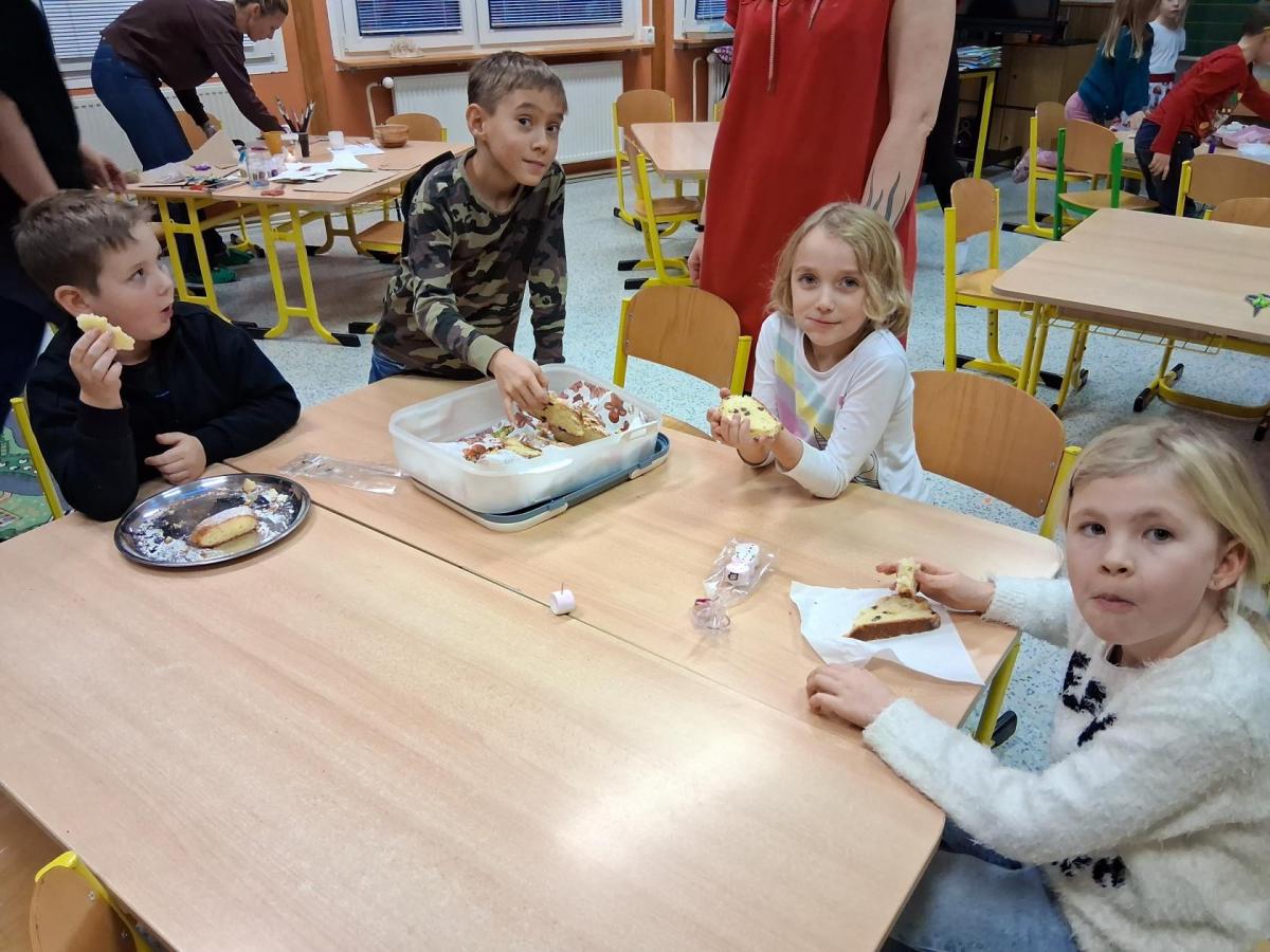 Tvoření, které si pro nás připravilo několik maminek a jedna teta a babička, bylo různorodé. Pod jejich dohledem i za vydatné pomoci jednoho tatínka vznikali skřítci z vlny, svícny ze sklenic, dárkové vánoční tašky, papíroví andílci a kouličky na stromeček z košíčků na muffiny. Velkou radost měli všichni ze sněhuláků vyrobených z marshmallow bonbonů, které si ovšem někteří hned po vyrobení snědli ?. Nechybělo ani vynikající občerstvení v podobě vánočky a bábovky ve tvaru stromečku, o které se také postaraly některé maminky. Bylo to příjemně strávené adventní odpoledne, za které ještě jednou moc děkujeme.