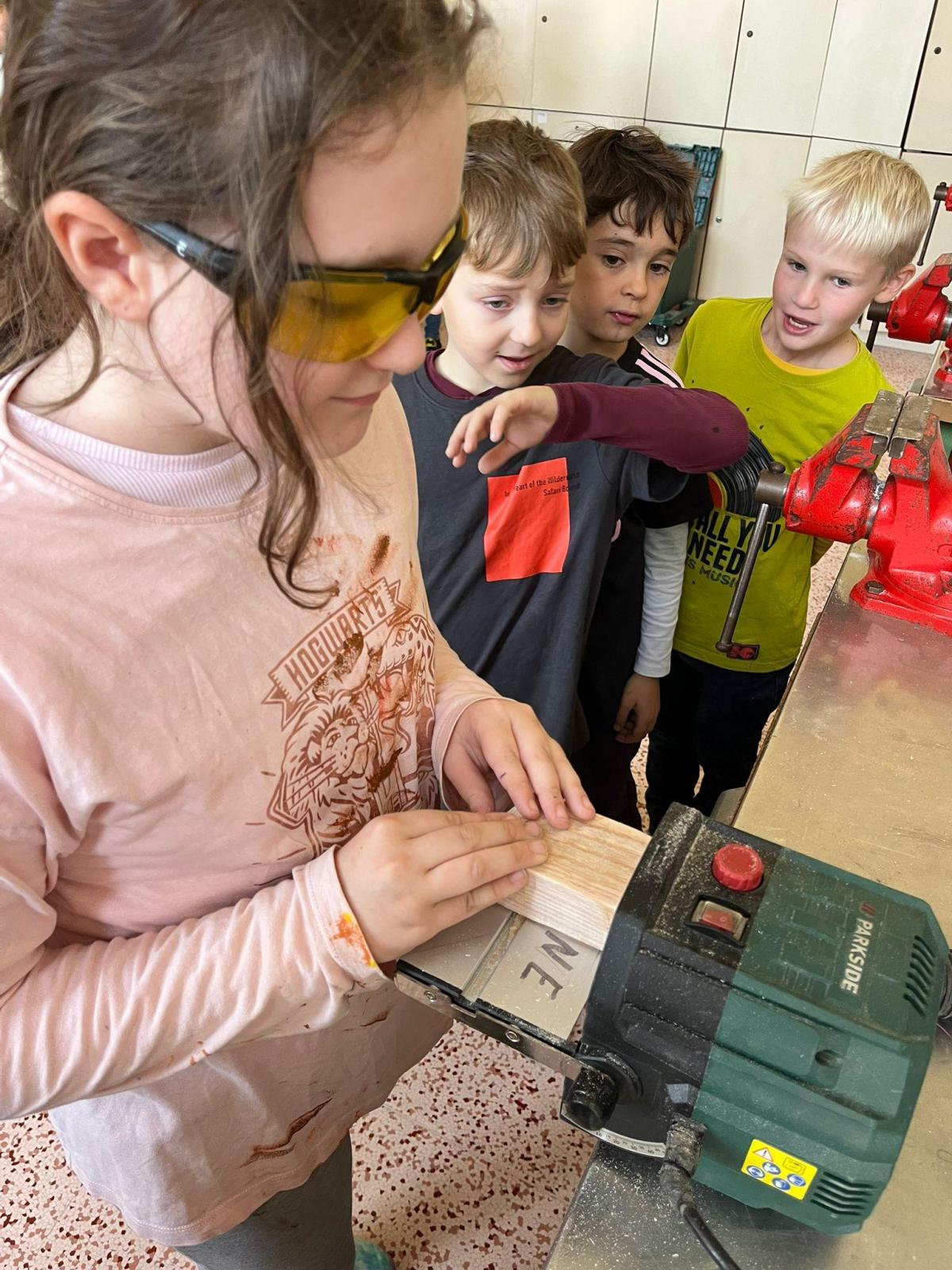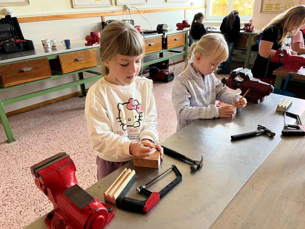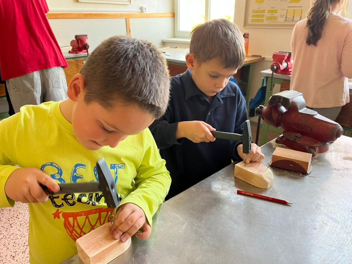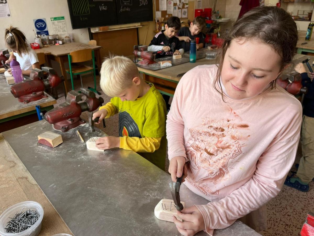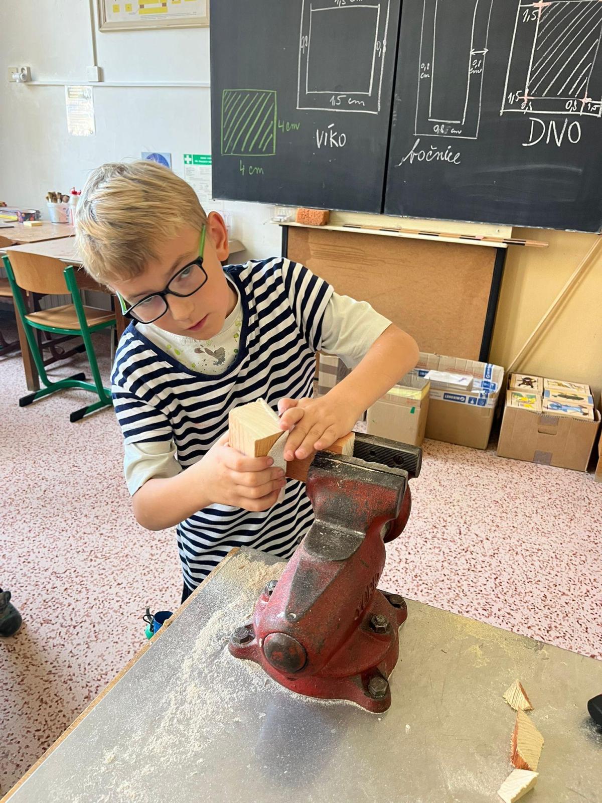 V pátek 31. října jsme se neučili ve třídě, ale šli jsme do školní dílny. Čekal tam na nás pan Oldřich Kysela a jeho syn. Na pracovním stole měl každý připravené nářadí – kladívko, pilku, svěrák a dřevěný materiál. Na dalším stole stála bruska a vrták. Nejprve jsme si pozorně vyslechli bezpečnostní pokyny a jak pracovat s nářadím. Nakonec jsme se dozvěděli, co budeme vyrábět a také pracovní postup.
