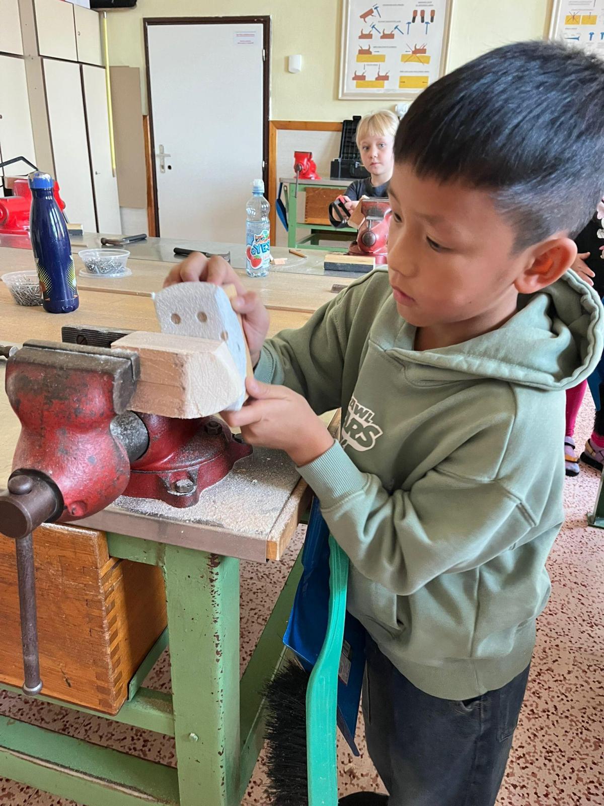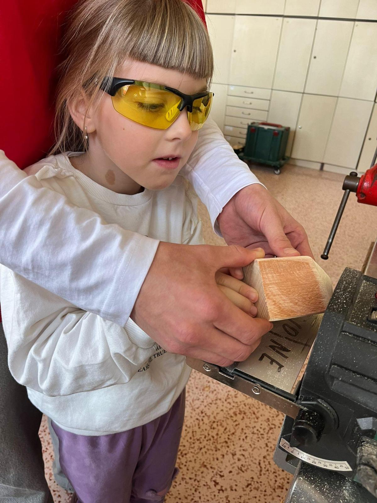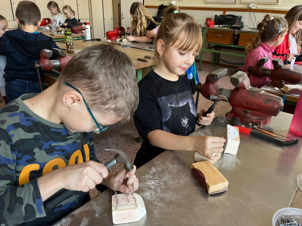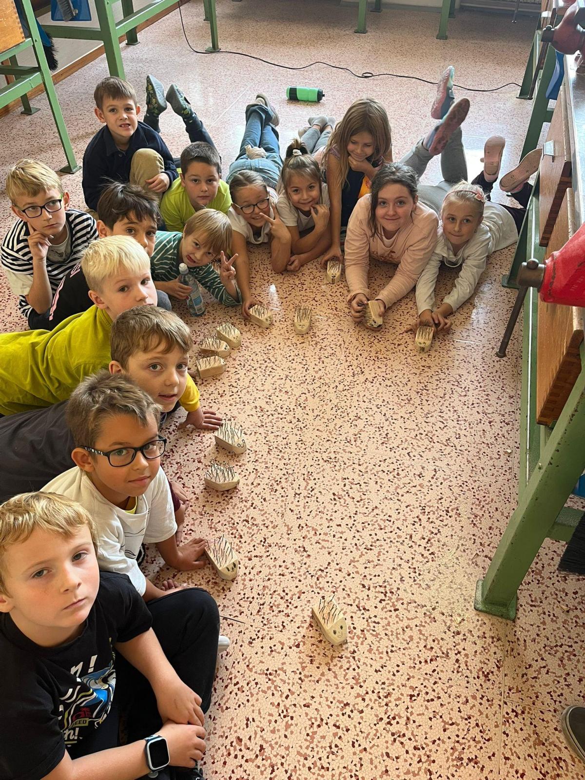 V pátek 31. října jsme se neučili ve třídě, ale šli jsme do školní dílny. Čekal tam na nás pan Oldřich Kysela a jeho syn. Na pracovním stole měl každý připravené nářadí – kladívko, pilku, svěrák a dřevěný materiál. Na dalším stole stála bruska a vrták. Nejprve jsme si pozorně vyslechli bezpečnostní pokyny a jak pracovat s nářadím. Nakonec jsme se dozvěděli, co budeme vyrábět a také pracovní postup.