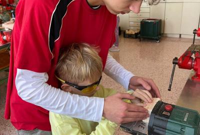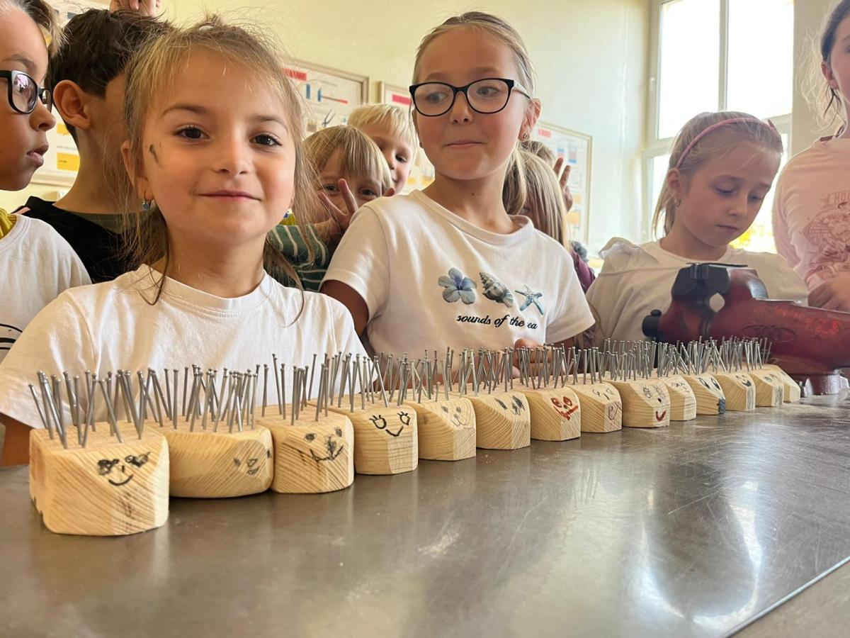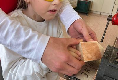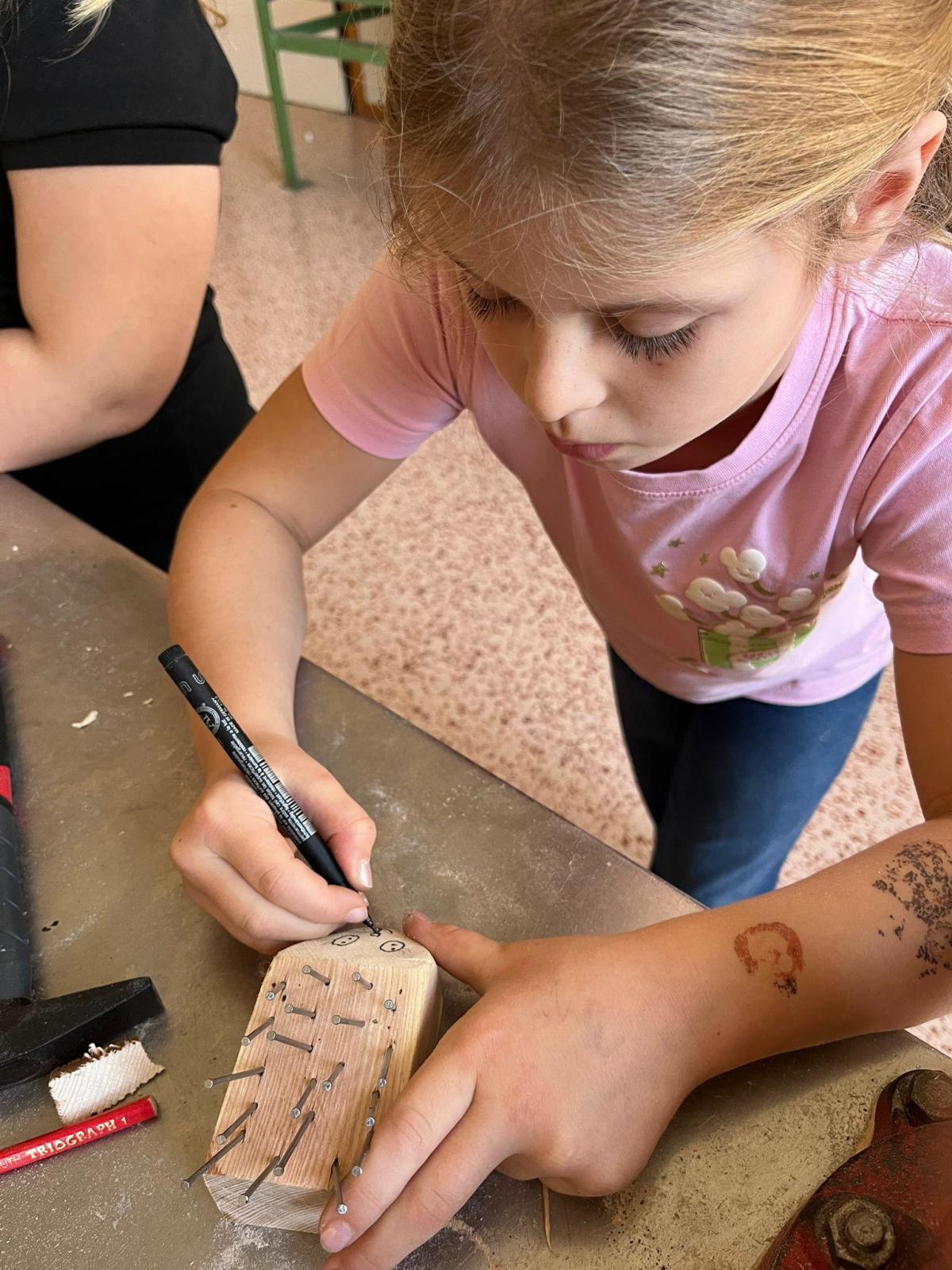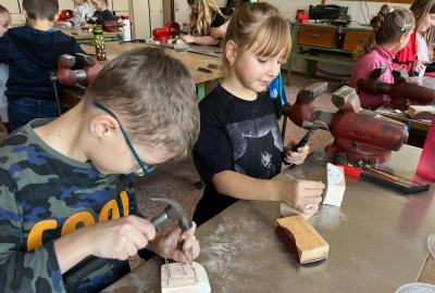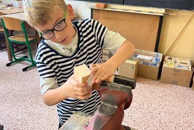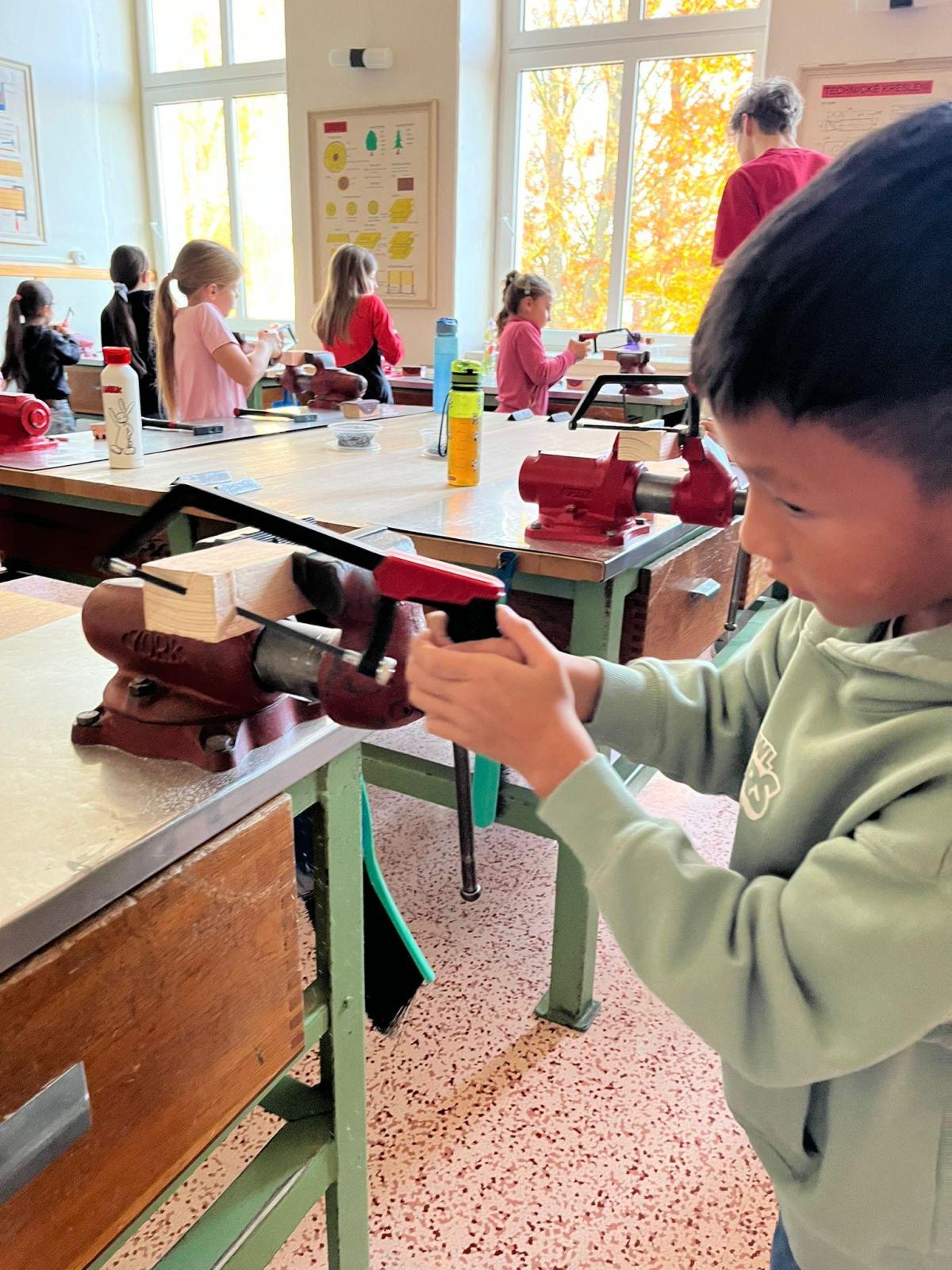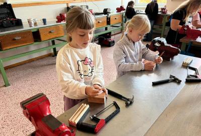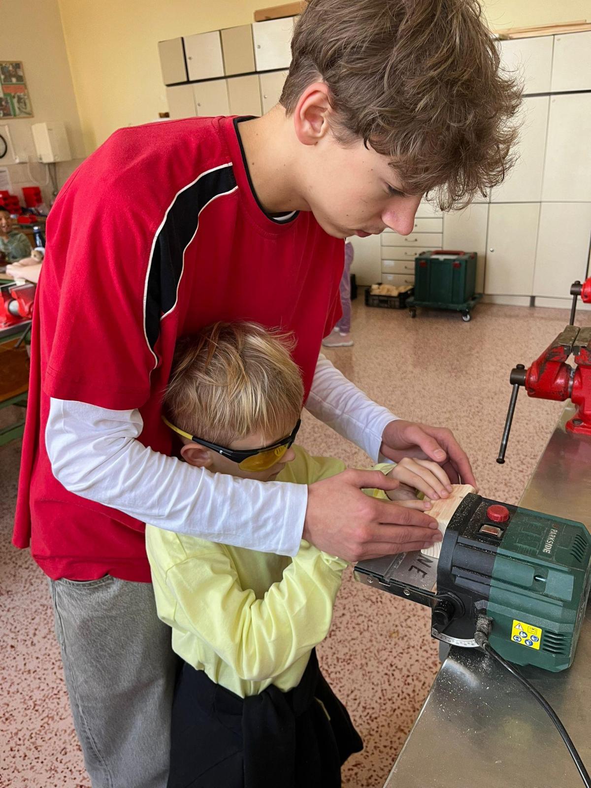 V pátek 31. října jsme se neučili ve třídě, ale šli jsme do školní dílny. Čekal tam na nás pan Oldřich Kysela a jeho syn. Na pracovním stole měl každý připravené nářadí – kladívko, pilku, svěrák a dřevěný materiál. Na dalším stole stála bruska a vrták. Nejprve jsme si pozorně vyslechli bezpečnostní pokyny a jak pracovat s nářadím. Nakonec jsme se dozvěděli, co budeme vyrábět a také pracovní postup.