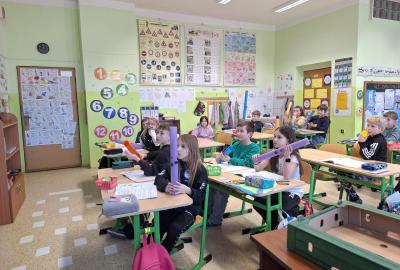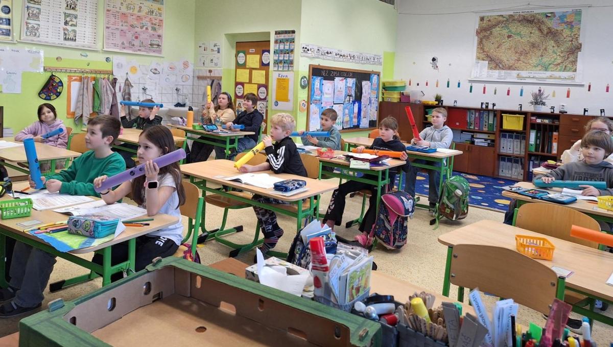 O hodině hudební výchovy jsme chtěli být součástí orchestru, proto paní učitelka přinesla ozvučné trubice neboli Boomwhackers a podle předlohy s melodii jsme si zahráli pár českých i světových písniček.