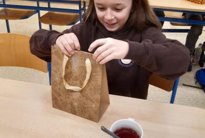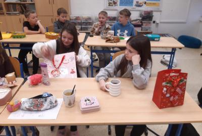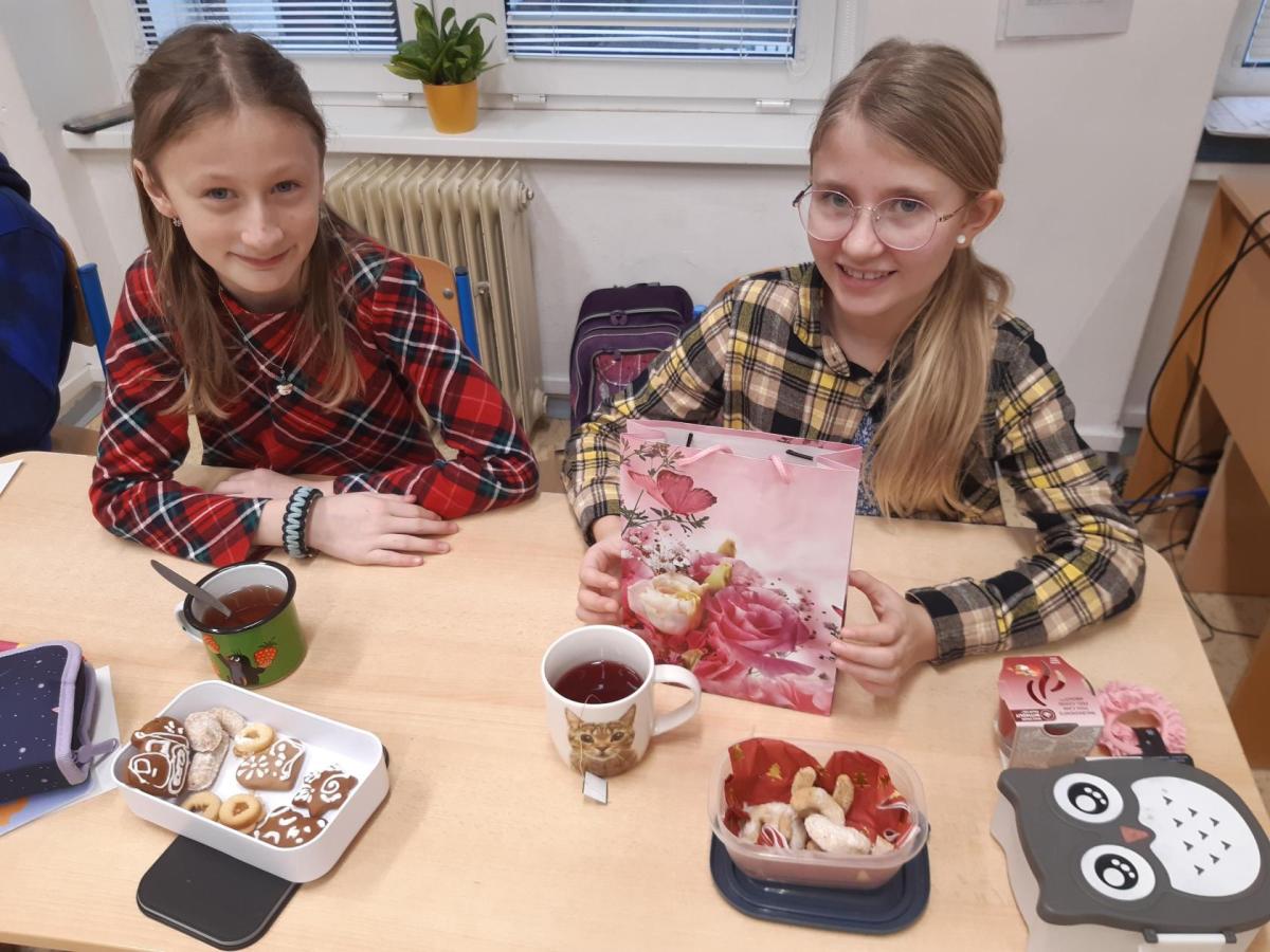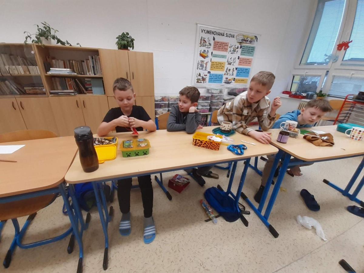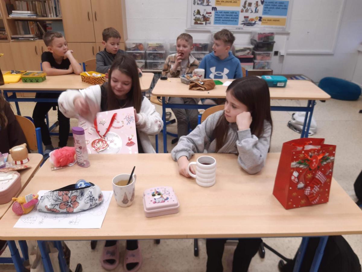Nejdříve jsme plnili vánoční úkoly, zpívali koledy a vyprávěli si o vánočních zvycích. Pak nám paní učitelka uvařila čaj a my jsme si vyndali krabičky s cukrovím, které jsme si navzájem nabízeli a ochutnávali. Nakonec přišla ta nejdůležitější část – rozdávání a rozbalování dárků. Ježíšku, moc děkujeme.